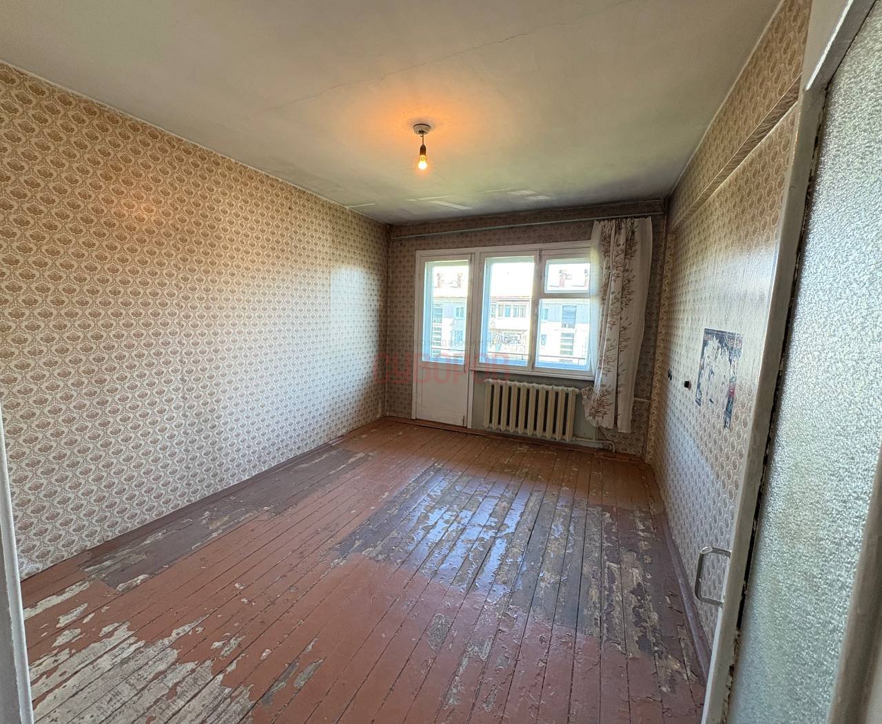 Квартира в обычном состоянии. Установлены стеклопакеты, радиаторы чугунные. На полу линолеум, потолок побелен.