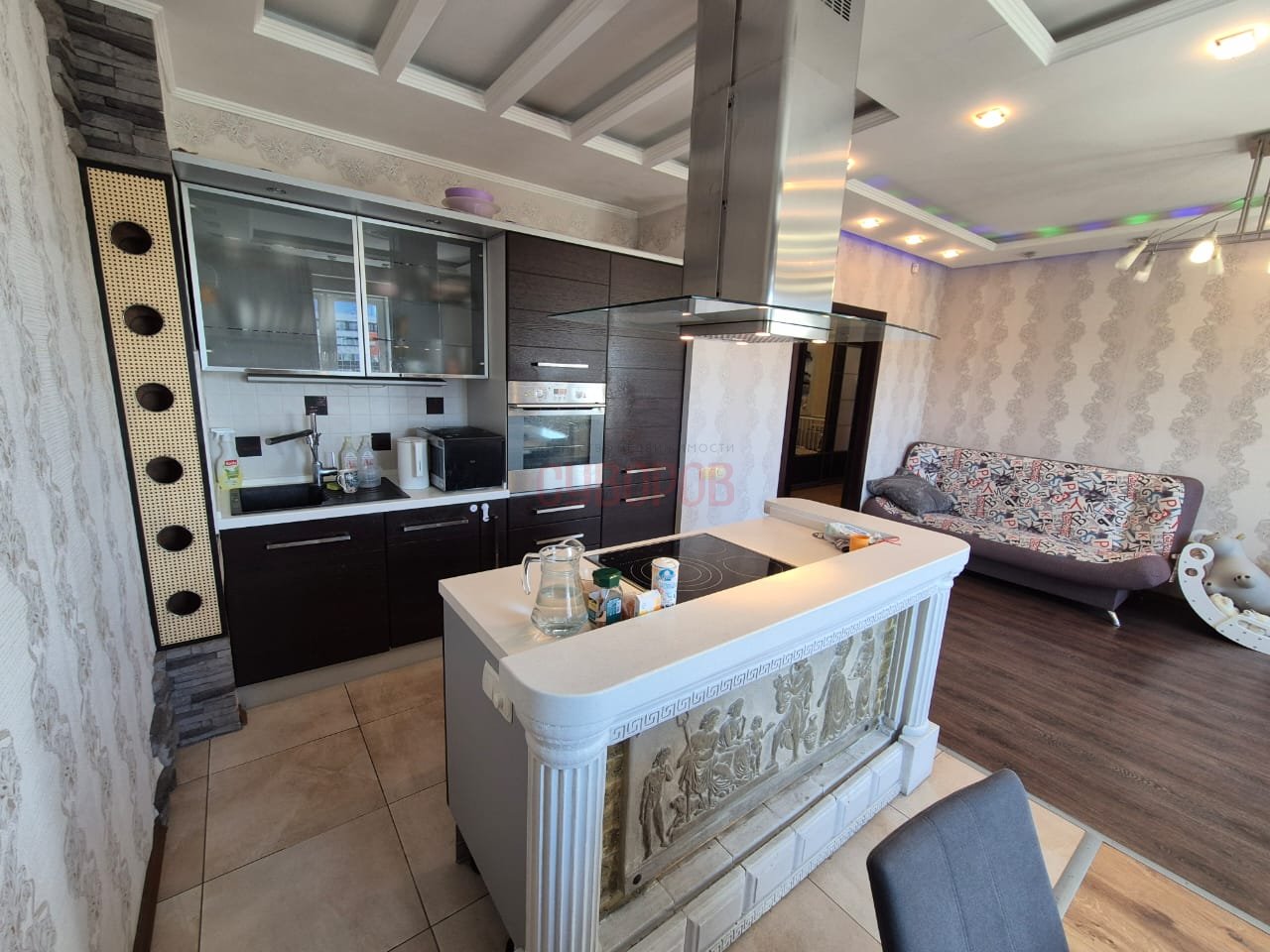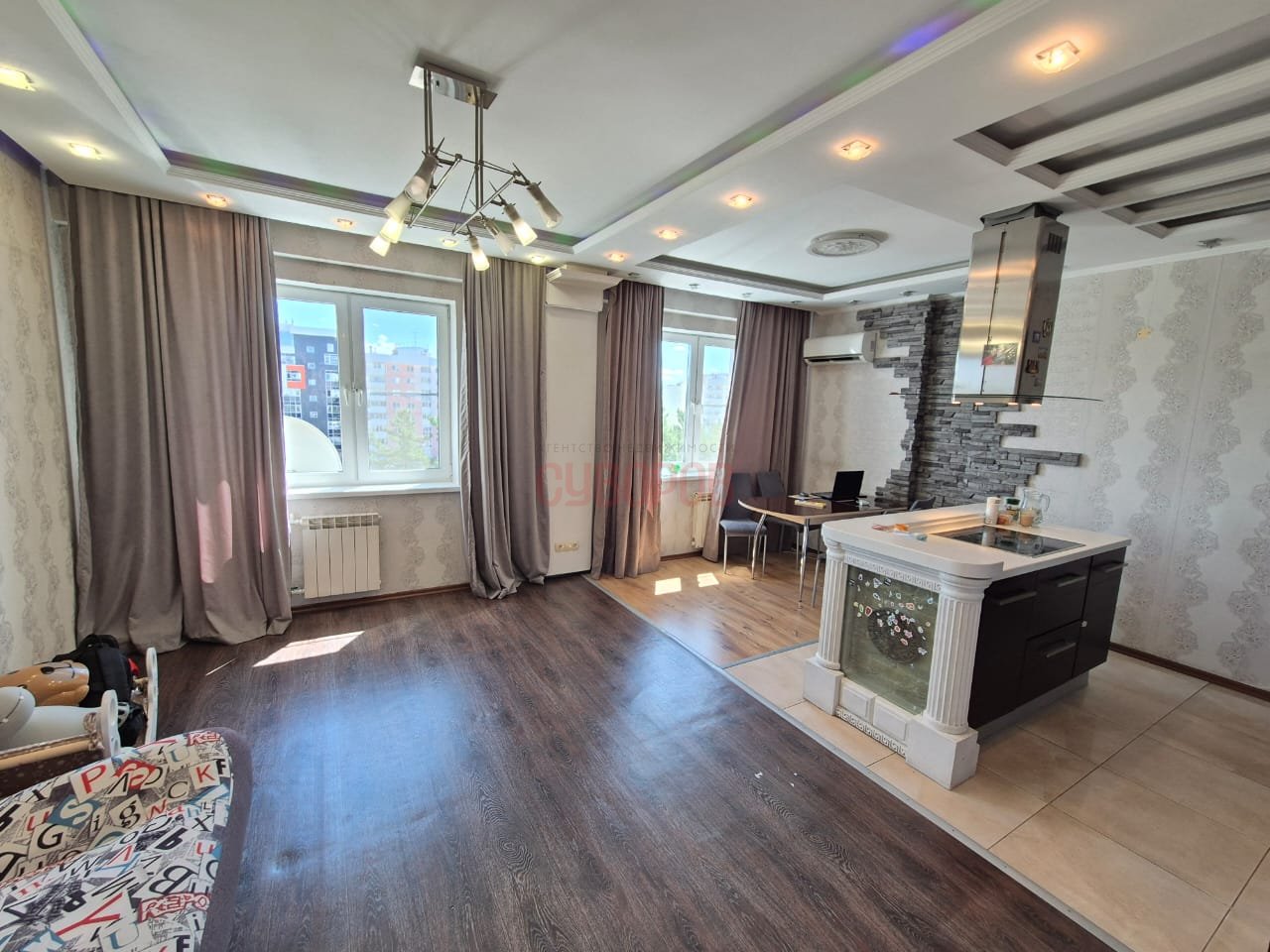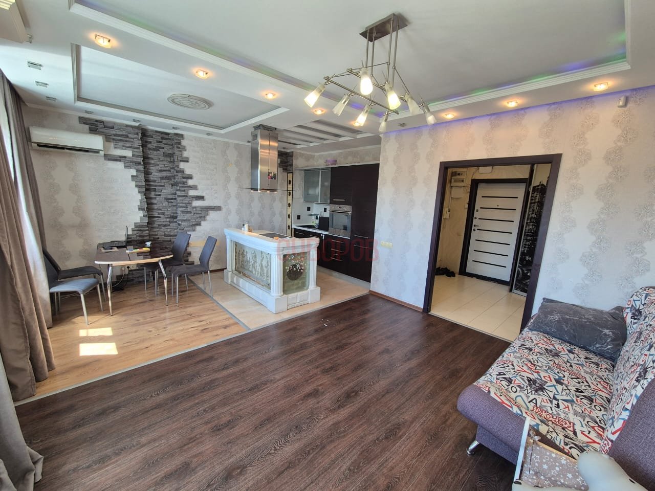 В квартире выполнен качественный ремонт, а также предусмотрены различные зоны освещения, создающие уютную атмосферу. Квартира в хорошем капитальном ремонте с большой гостиной, чистом и ухоженном состоянии, трубы заменены, стеклопакеты установлены, на полу ламинат, кафель и линолеум, санузел совмещен- в кафельной плитке, водосчетчики установлены, входная дверь евро, м/к двери свежие, потолок- натяжной и двухуровневый, радиаторы алюминиевые.