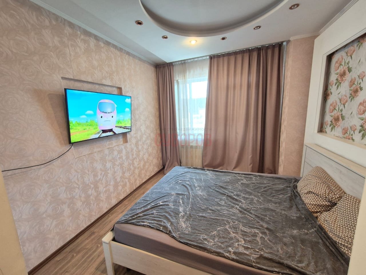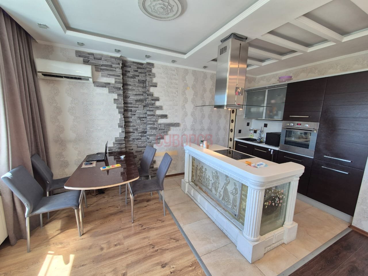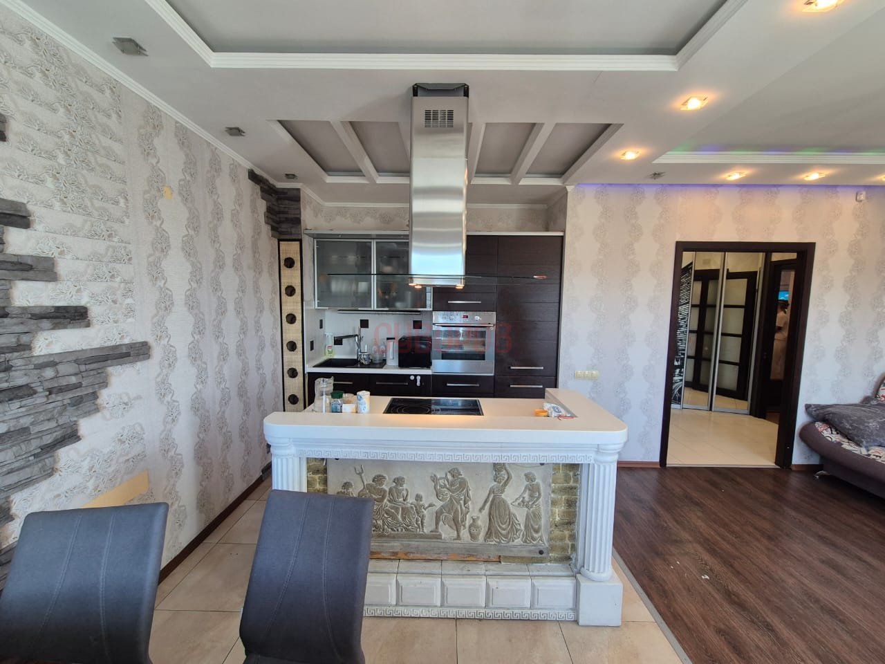 В квартире выполнен качественный ремонт, а также предусмотрены различные зоны освещения, создающие уютную атмосферу. Квартира в хорошем капитальном ремонте с большой гостиной, чистом и ухоженном состоянии, трубы заменены, стеклопакеты установлены, на полу ламинат, кафель и линолеум, санузел совмещен- в кафельной плитке, водосчетчики установлены, входная дверь евро, м/к двери свежие, потолок- натяжной и двухуровневый, радиаторы алюминиевые.