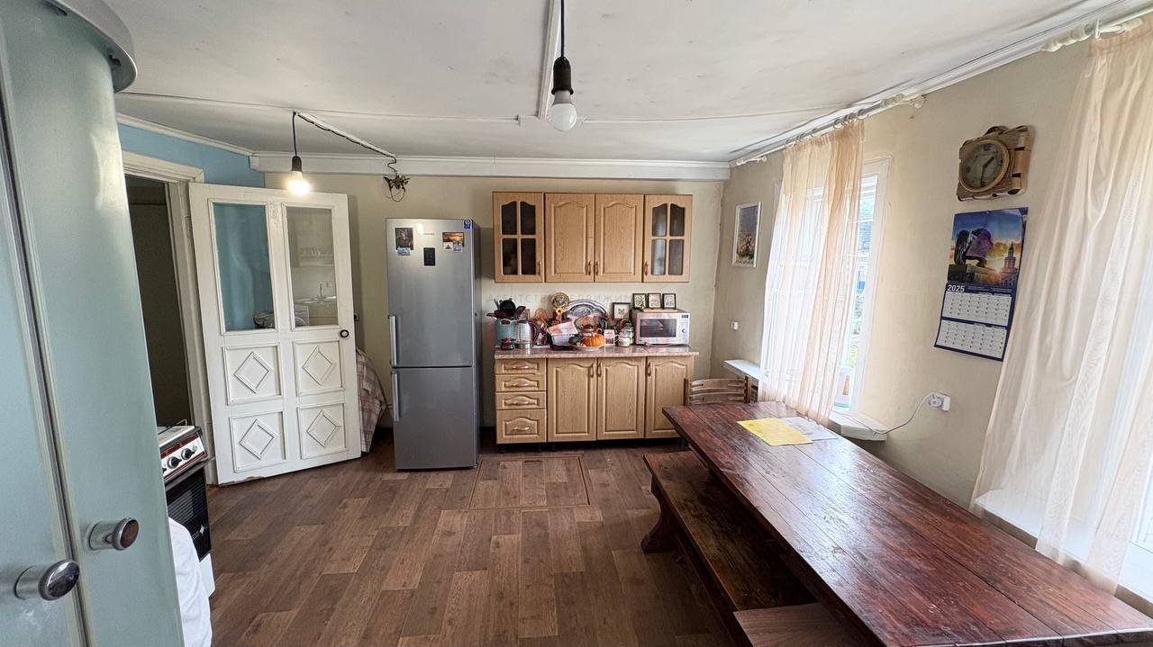 Материал - брус 150. Обшит деревом - имитация брус. Кровля - металл профиль. Установлены стеклопакеты, межкомнатные двери, натяжной потолок, алюминиевые радиаторы, на полу ламинат. Санузел без отделки. Канализация - септик.