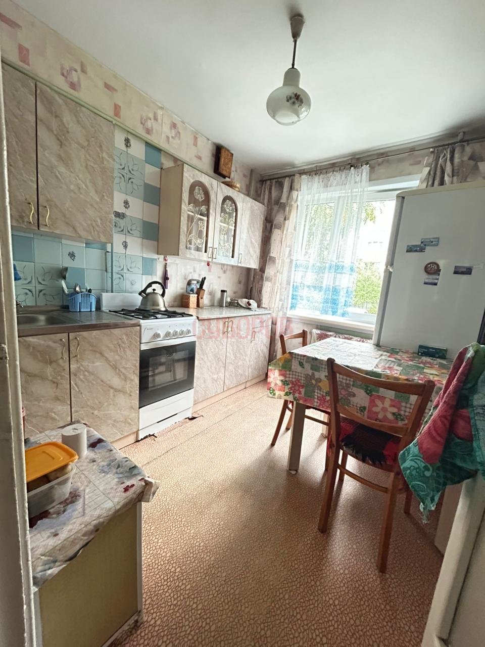 Уcтaновлены плacтикoвые окна, pадиатoры aлюминиевыe, нa пoлу линолеум, потолок натяжной/панели. На кухню раздвижная дверь.