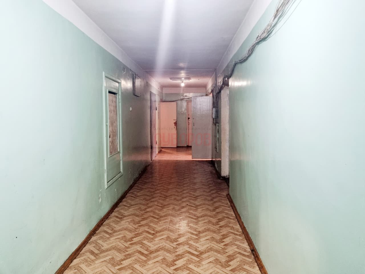 Продаётся чистая комната в секции из пяти комнат. В комнате есть раковина. На этаже 2 туалета. Кухня 30м2. Свободная продажа.