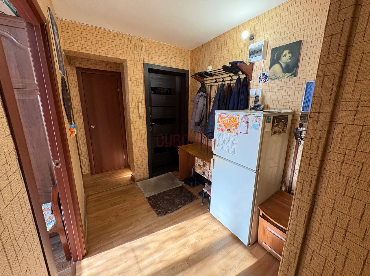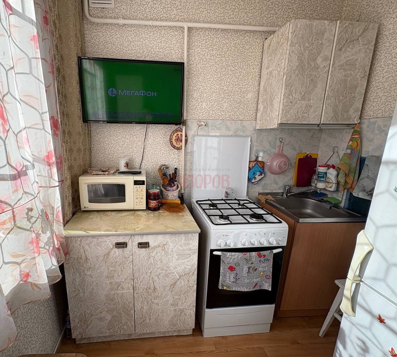При продаже в квартире остается кухонный гарнитур, стенка, комод, шкаф в комнате, прихожая, морозильная камера на балконе.