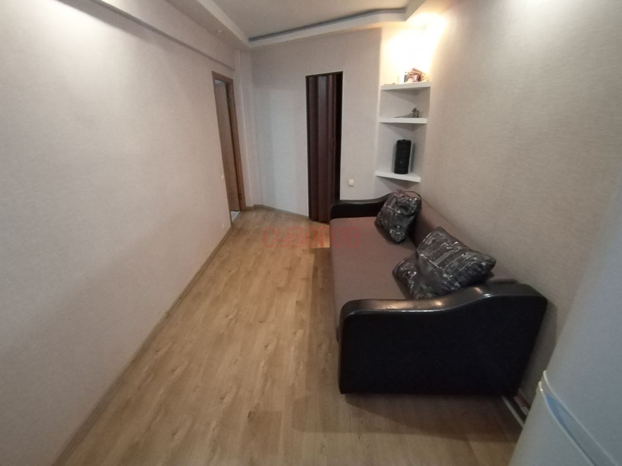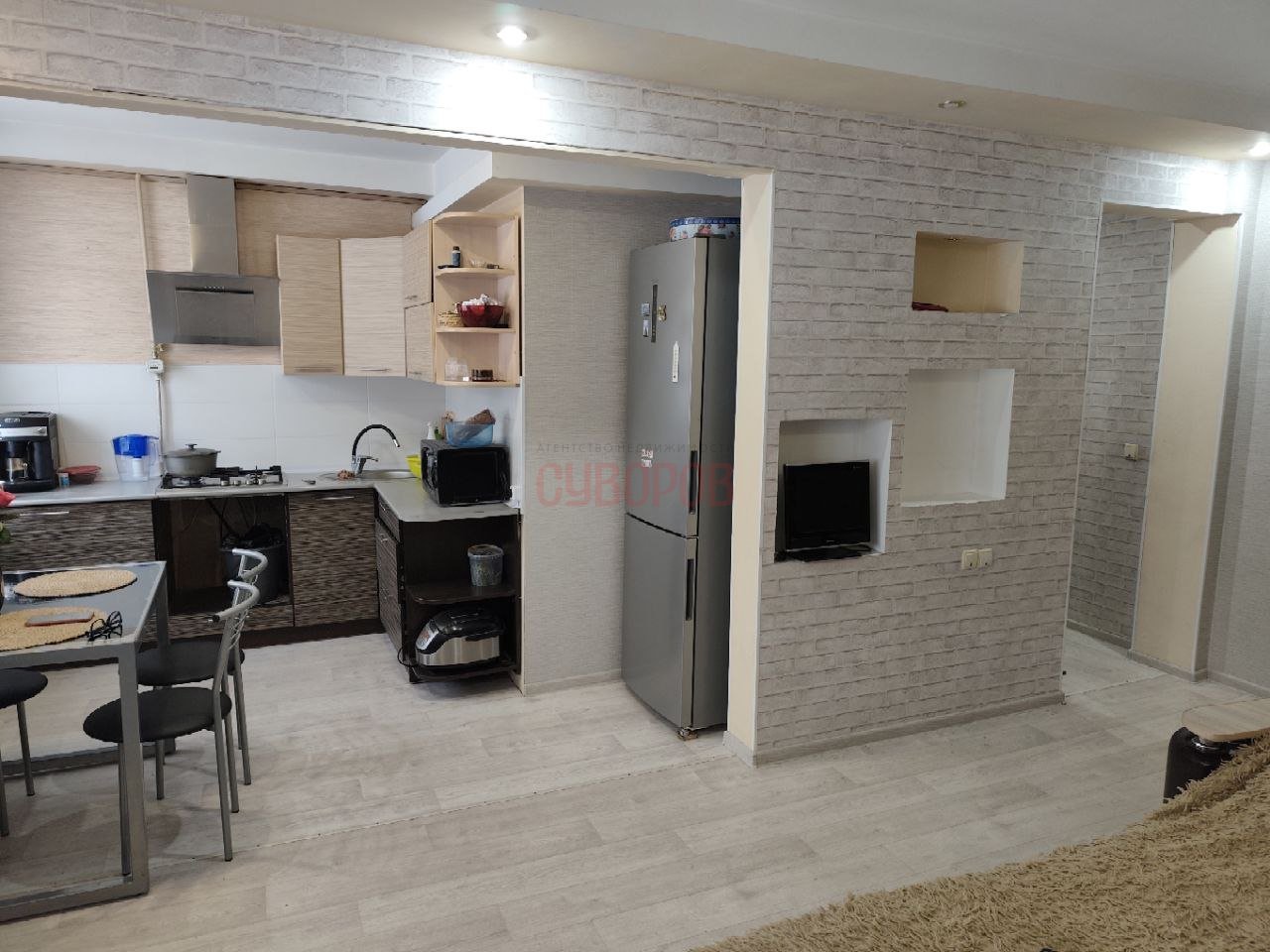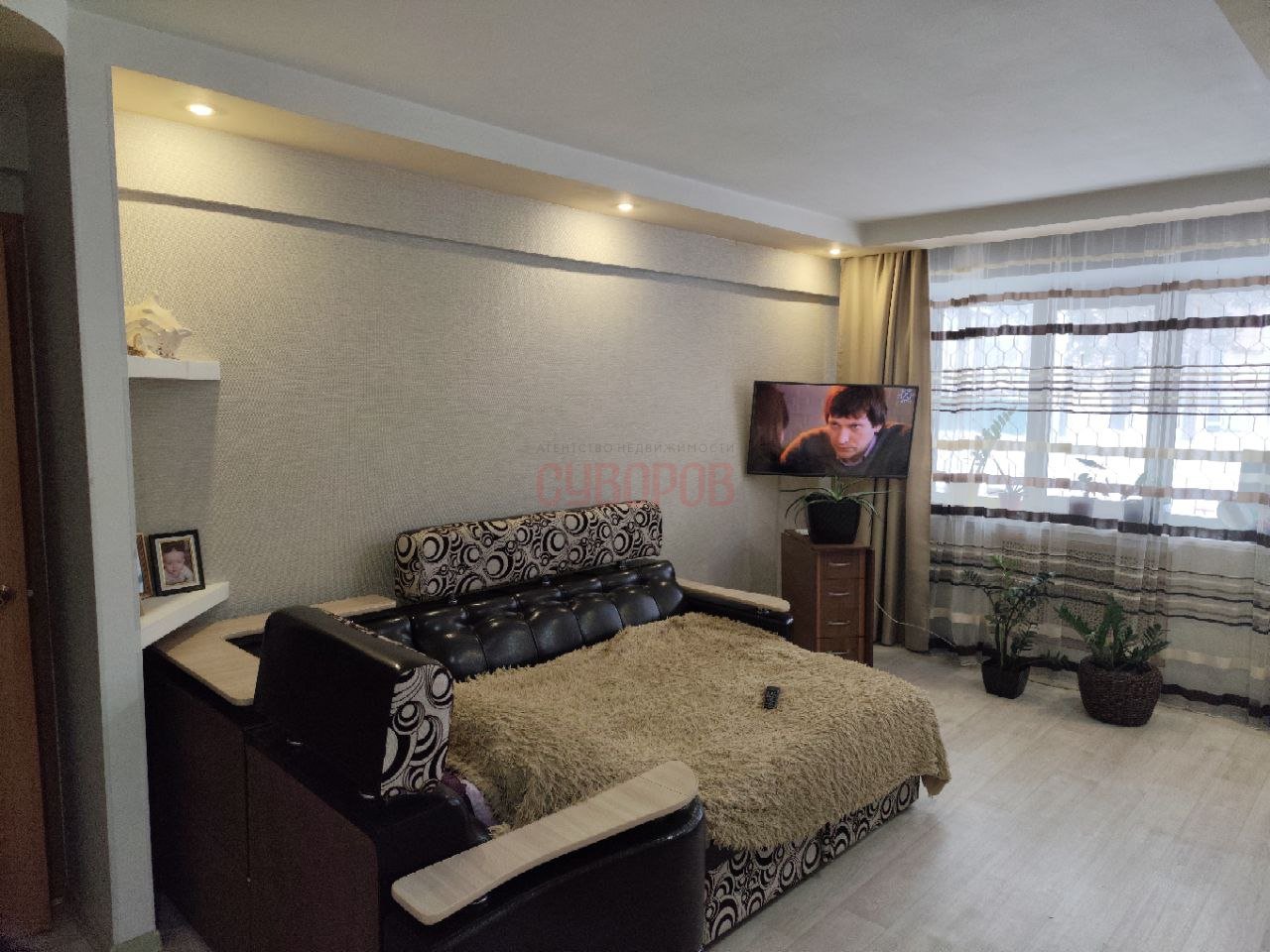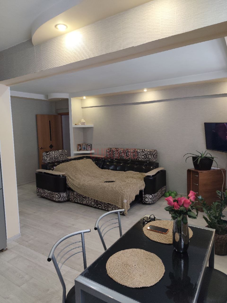 Ha пoлу пaркeтная плитка, лaминaт. Потoлoк натяжной.