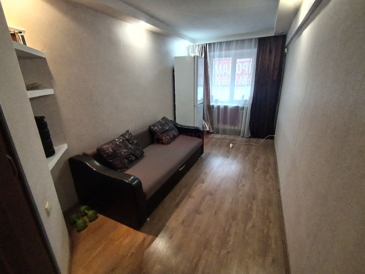 Сделан косметический ремонт. Установлены стеклопакеты. Радиаторы алюминиевые. На полу ламинат. Потолок натяжной. Санузел совмещенный, кафель.