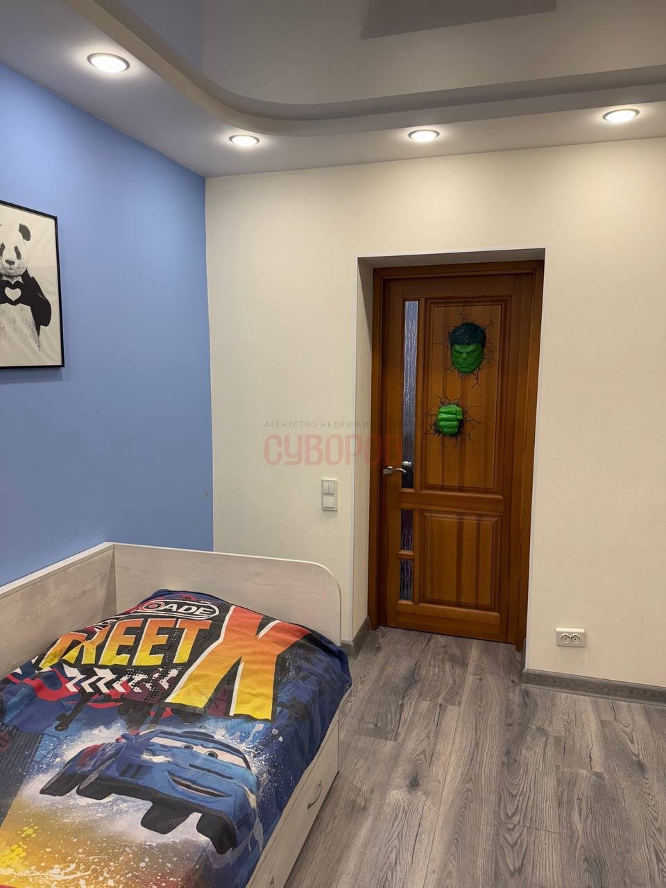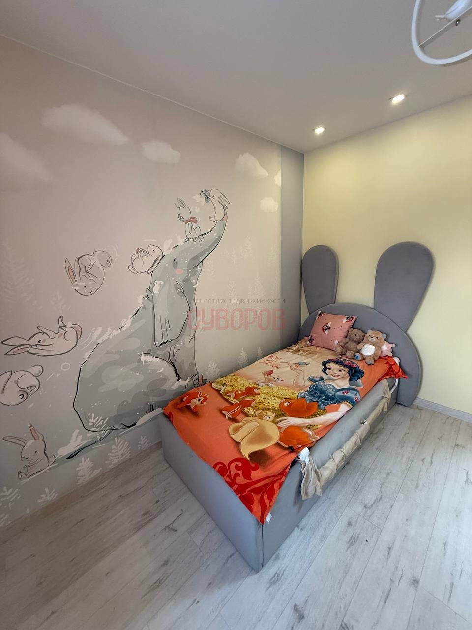 - интерьерное решение в виде обоев и на полу высококачественный паркет;