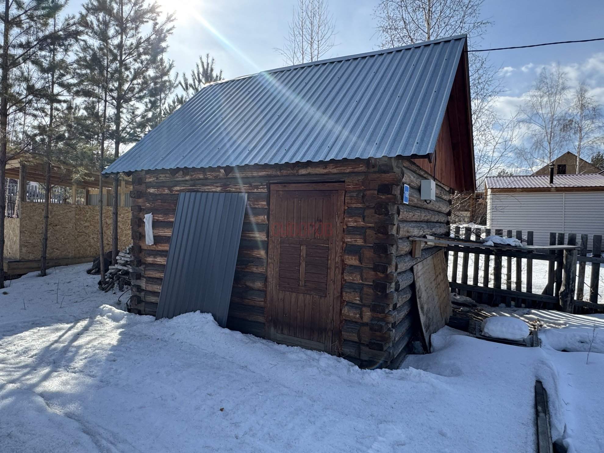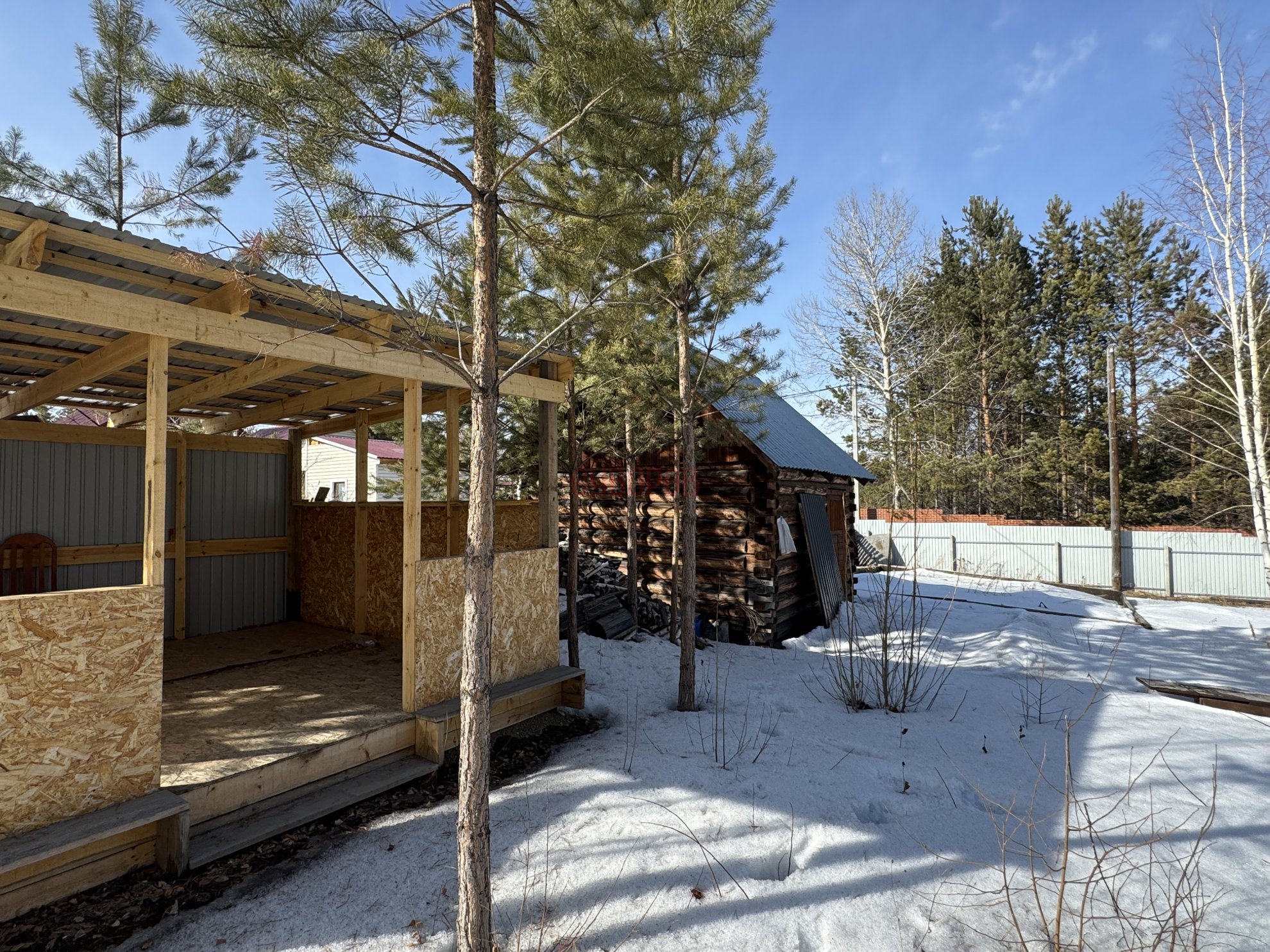 Участок огорожен забором на фундаменте металлопрофиль. На участке гараж высотой потолков 3,5 м, под большегруз. Баня на фундаменте 6*4 метров. Летний домик. Летний водопровод. Проведено электричество 220 Вт.